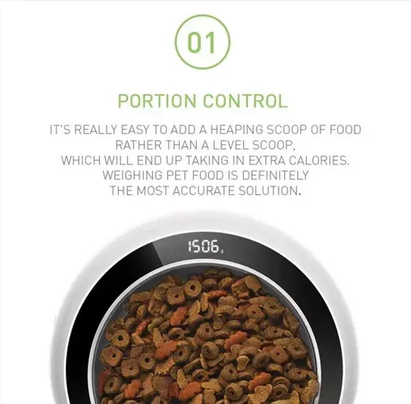 Con el nuevo bol inteligente, puede pesar fácilmente cada comida con el control de porciones. Puedes ajustarlo con unos pocos botones y así sabrás exactamente cuánto está comiendo tu mascota.